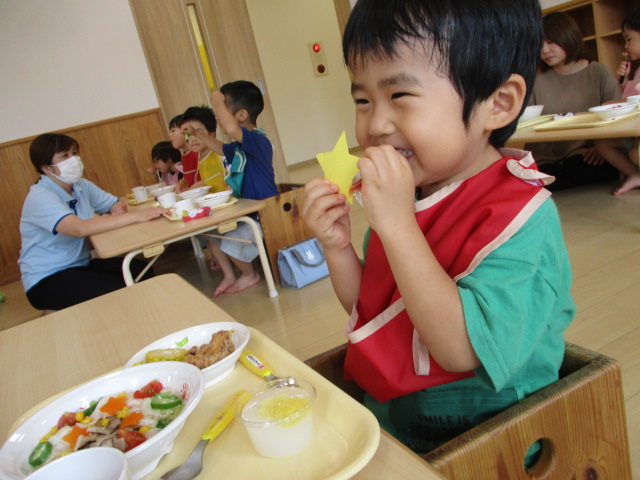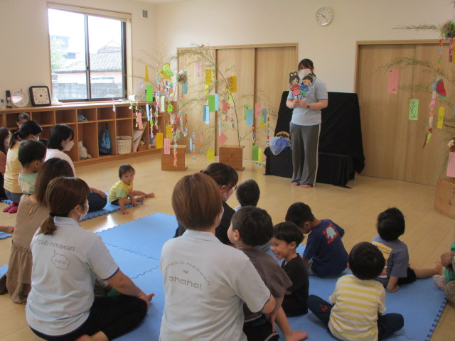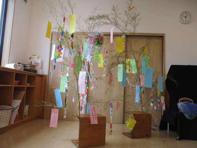 今日は七夕。織姫様と彦星様が年に一度だけ、天の川で会える日とされています。七夕お楽しみ会では、お願い事を書いた短冊を笹に飾り、みんなで七夕のお話を聞いたりうたを歌ったりと楽しんでいました。みんなの願い事が叶うといいな☆