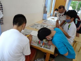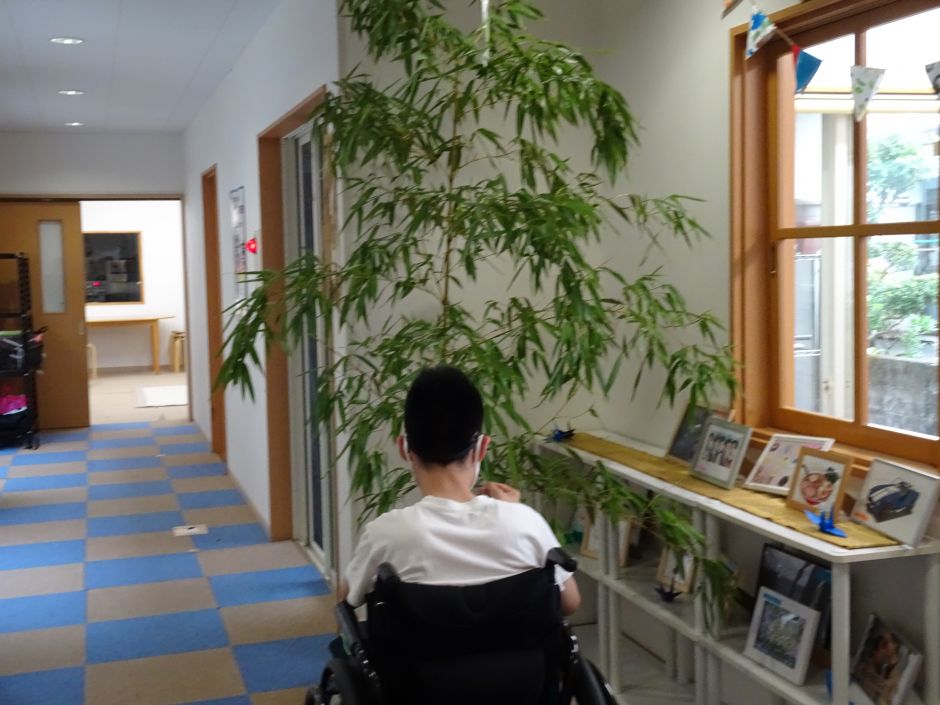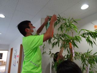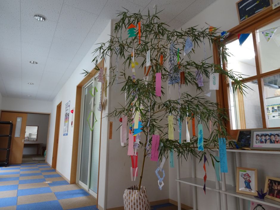 七月七日は“七夕”でしたね。今年も立派な笹が届いたので、なかまで七夕行事を行いました。 七夕の由来についての話を聞いた後は、みんなで短冊に願い事を書きました。「えっ、何書けばいいかな?」と悩んだり「お願い事、たくさん書いてもいい?」など、みんなそれぞれの願い事を書きあげました。 書き終わったら笹の好きな所に飾っていきました。「僕は、一番上のほうにつけたい。」と椅子に乗って飾る子もいました。 みんなの願い事が叶いますように・・・
