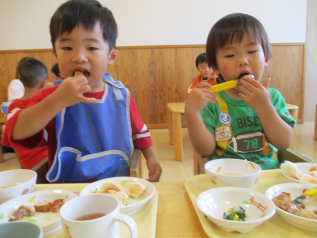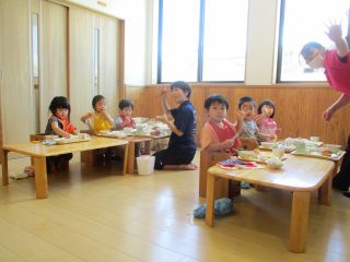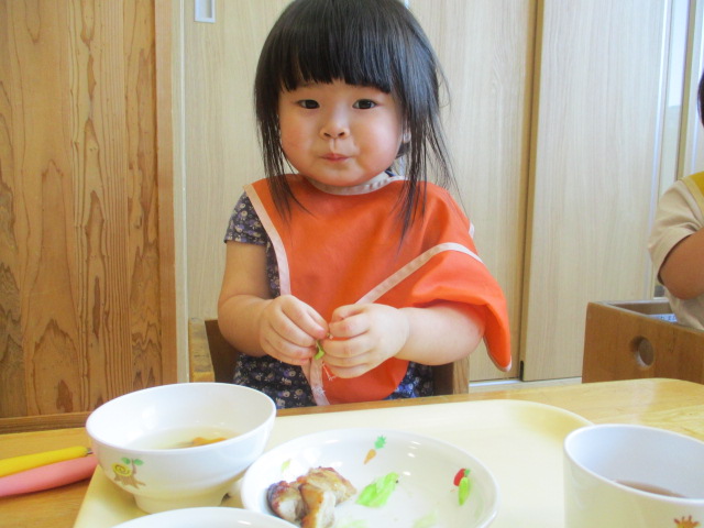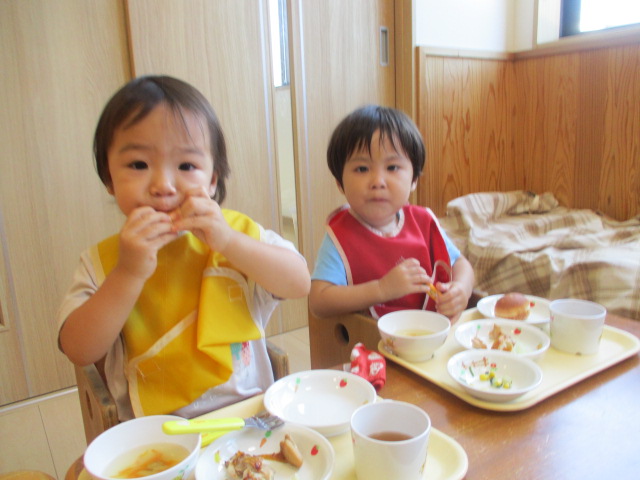 給食の時間、みんなで食べていると「こんにちは~!」と給食を作ってくれている台所もぐもぐの職員がみんなが食べている様子を見に来てくれます。みんなニコニコでハイタッチしたり手を振ったり「美味しい!」と感想を伝えたり、嬉しそうです。いつも美味しい給食、ありがとうございます♪