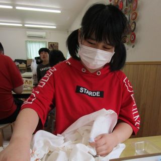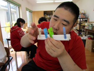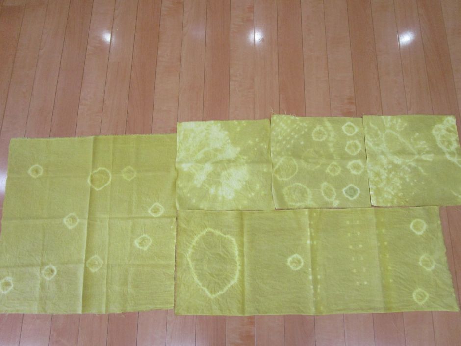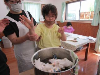 庭の花壇で育てたマリーゴールドで草木染めをしました。ビー玉を輪ゴムで縛ったり、洗濯ばさみで挟んだりして、模様を作ります。どんな模様になるか楽しみにしながら、鍋に投入!!熱いよーと言いながら上手に鍋に入れます。毎回、出来上がるまでワクワク!ドキドキ!!