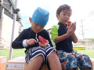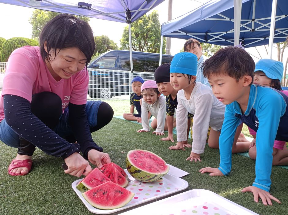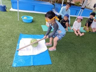 あははの畑で育てたスイカを収穫しました。毎日「大きくなってるかな?」と成長する様子を楽しみにみていました。最後のプールの日にみんなで「すいかわり」をしました。初めてのすいかわりに大興奮のこどもたち!!とってもあまくておいしかったです♡