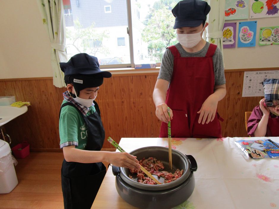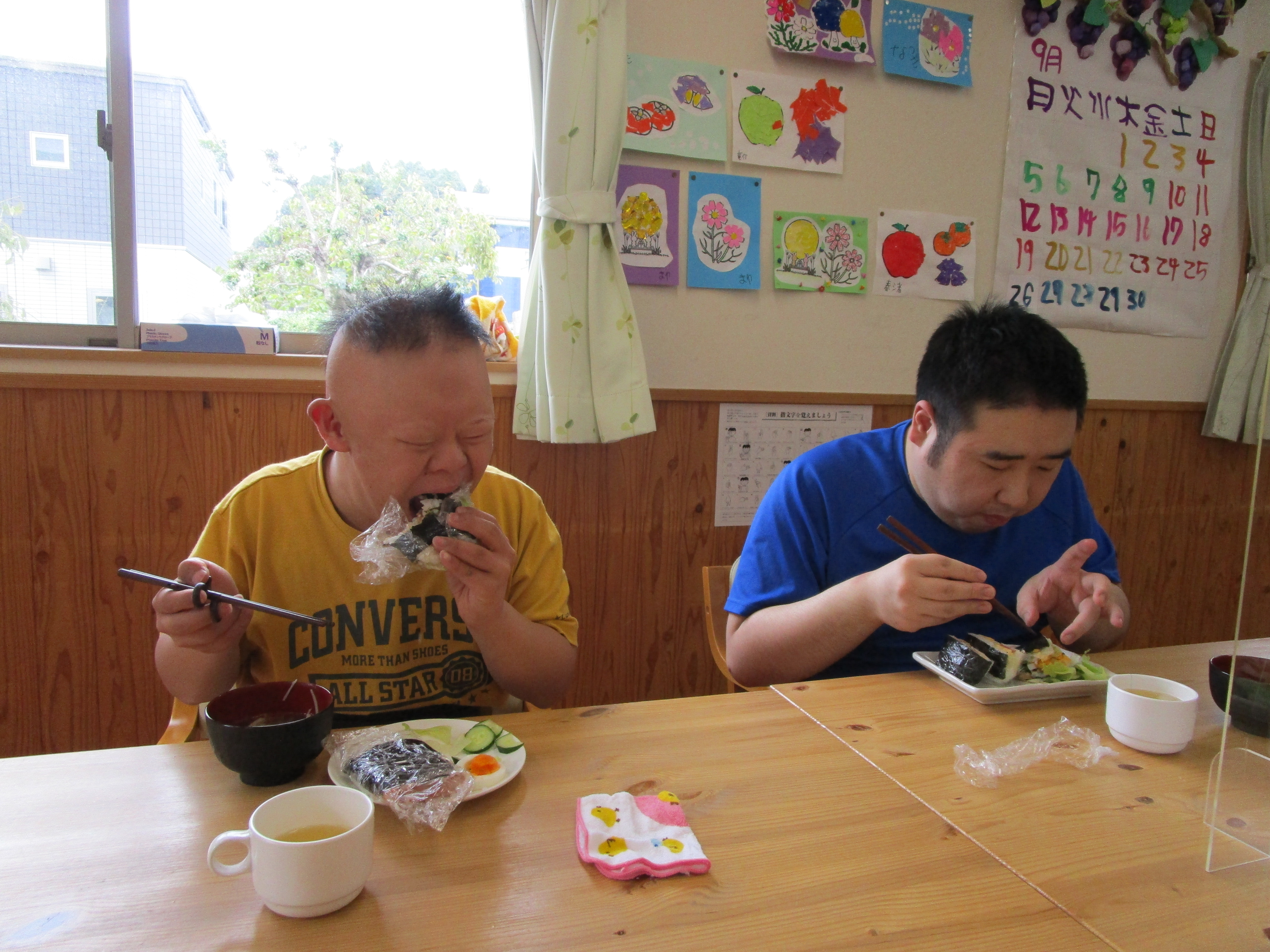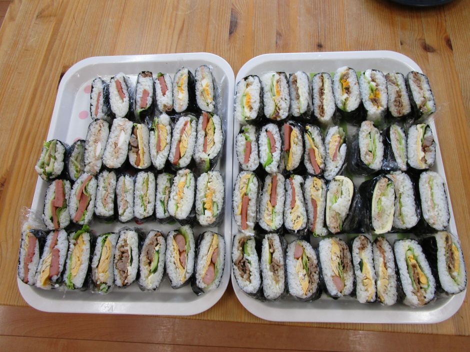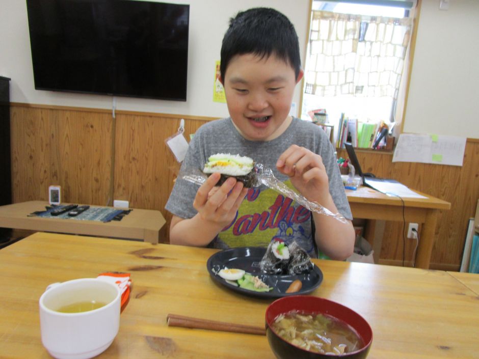 昼食時は、目の前に運ばれてきたおにぎらずを見て、早く食べたそうにニコニコ見つめている方もいました。もちろん残すことなくみなさんたいらげてしまいました♪自分たちで作るご飯は特別に美味しいです。
