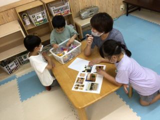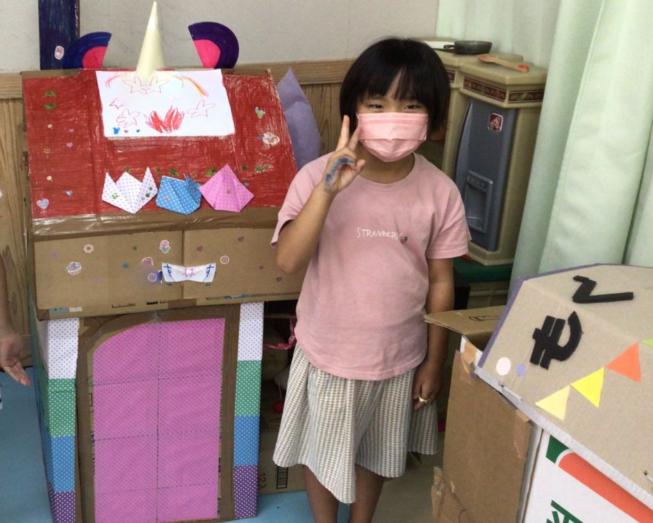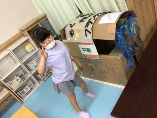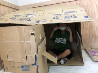いるかグループでは、子どもたちお待ちかねダンボール製作を行いました。まずは参考となる動画や写真を見ながら、自分たちが作りたいハウスのイメージを膨らませました!次はグループ内でコンセプト会議! 設計図を描きながら「こんなのはどう?」「それいいかも!」様々なアイディアが生まれました。その後は、切って貼って畳んで描いて、時間を忘れて楽しく作業を進めていく子どもたち。ゆめのダンボールハウスかんせ~い♪