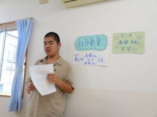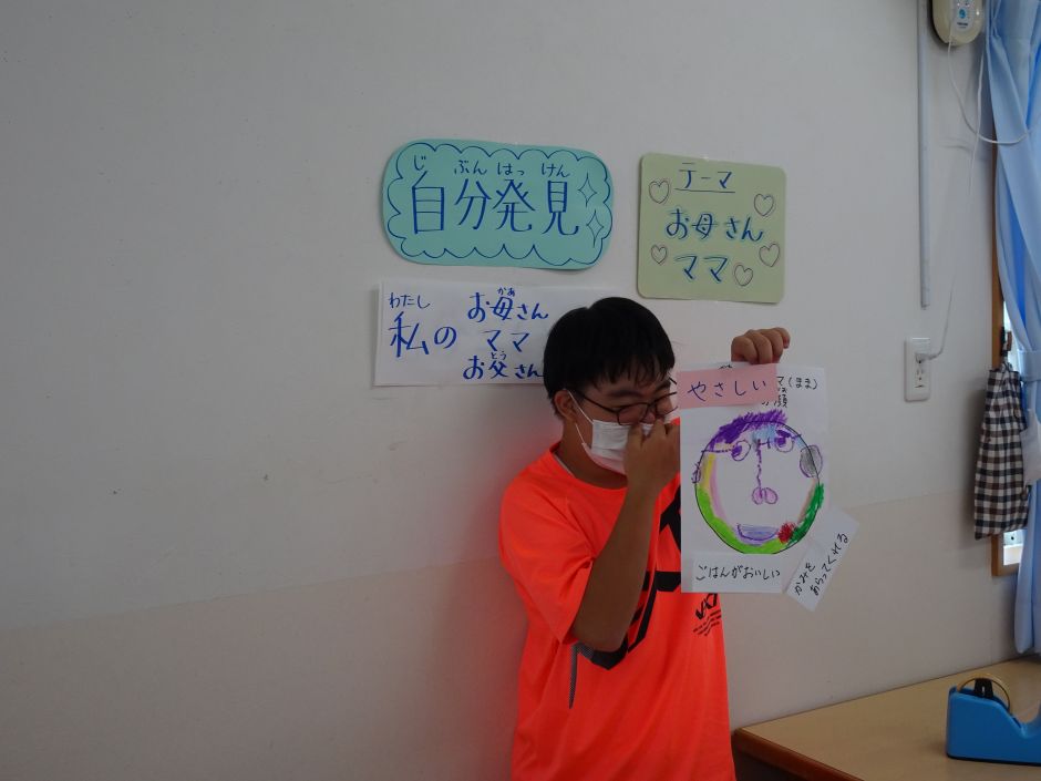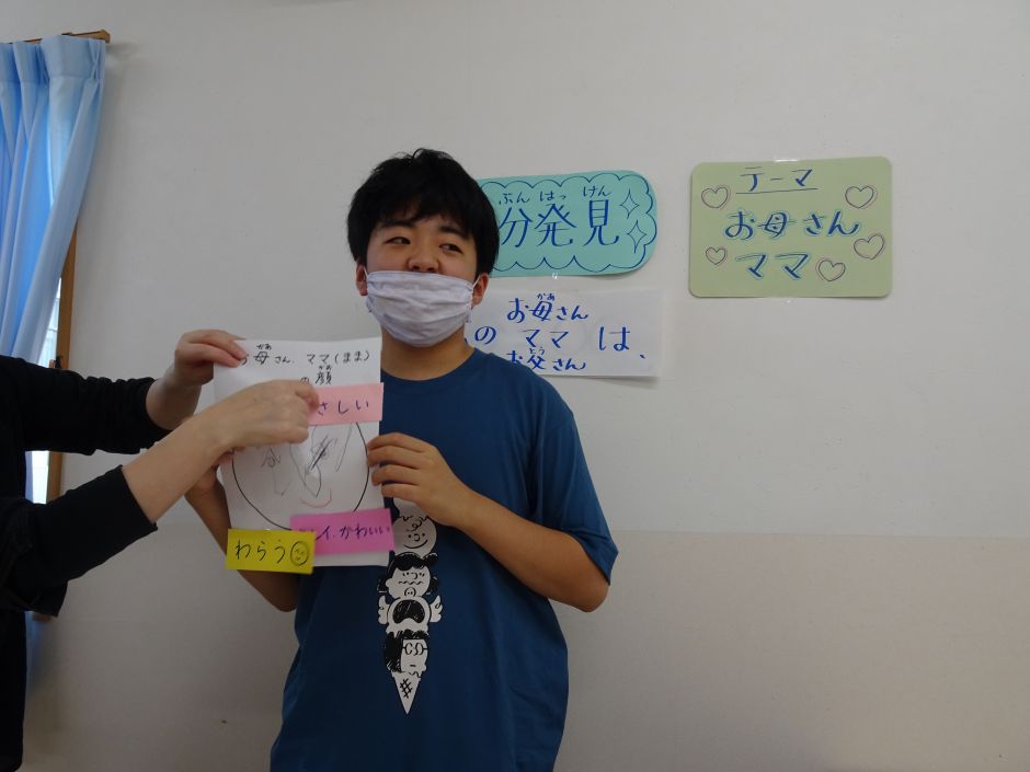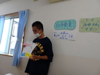 ¨自分のルーツを知る¨ということで、一番身近な¨お母さん、ママ、お父さん¨をテーマに活動しました。 まず顔を思い浮かべて、絵に描いてみること、どんな人か考えて言葉にしていくことなどを中心に行いました。 考えている間の子どもたちの表情はとても穏やかで、うまく表現できないお子さんたちも、職員の声かけでうなずいたり、にっこりしたり・・・。子どもたちにとって本当に本当に大好きな人なんだなぁと感じさせてもらいました。 ¨発表¨も自慢げで、安心した表情で、堂々と発表できていた子どもたちです。