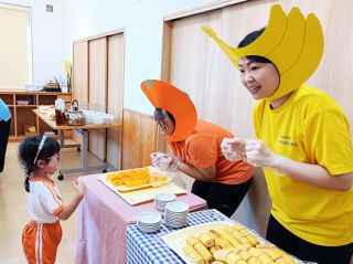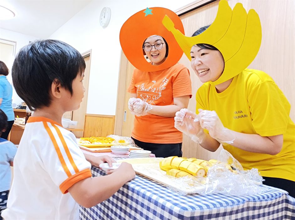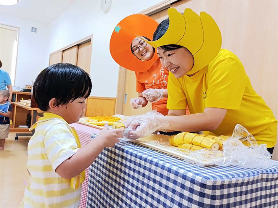 たいようグループのリクエスト献立給食がありました。唐揚げ・スパサラ・・・デザートはオレンジとバナナ‼突如現れたオレンジレディーとバナナレディーにびっくりしながらも「どっちがいいかな~?」と選ぶ楽しさもありました。楽しい給食の時間になりました!もぐもぐさん!いつもおいしい給食ありがと~♡