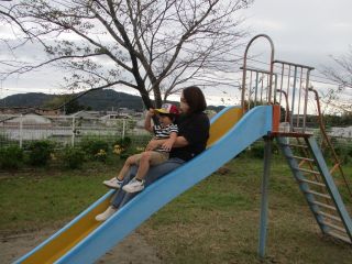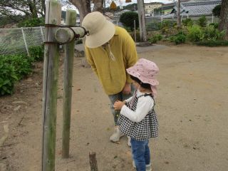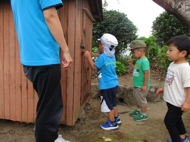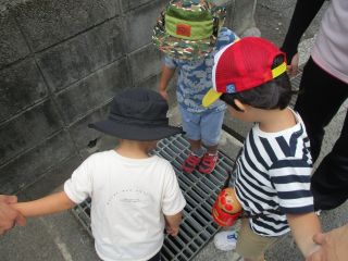 夏も終わり、朝晩と涼しくなってきたと思ったら日中はまだまだ暑い日が続いていますが、久しぶりに公園へ出かけました。 久しぶりと言うこともありみんな行く前からソワソワ。公園へ行く道中では、「水がある!」と排水部分を覗いてみたり、 柿の木やブドウの木を見つけたり。公園に着くと、「来て!」とお母さんと滑り台を滑ったり、小屋を見つけ「何が入ってるのかな…」と 興味深々!「お化けかな?」と言う子もいて楽しんでいました☆