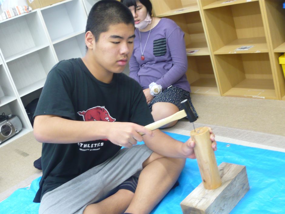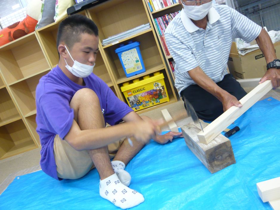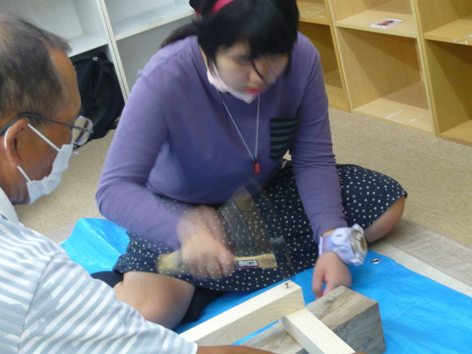 木を使ってベンチ作りに挑戦しました。大きな仕事は、のこぎりで木材を切ることと金づちで釘打ちでした。 練習時からかなりの集中力。使い慣れていない道具だからこそ、子どもたちは真剣そのもの。 釘打ちは、釘の長さが長過ぎて(職員のチョイスミス・・・)、なかなか木材に入っていかない・・・!それでも手を休め休め、最後まで一人で打ち切りました。釘と金づちのぶつかる音の響きも心地よかったようでした。 取り組んで1時間、結局完成できずのベンチでしたが、子どもたちは達成感の表情で、おやつに向かったのでした。