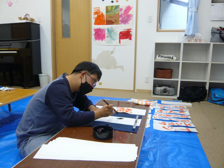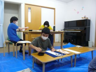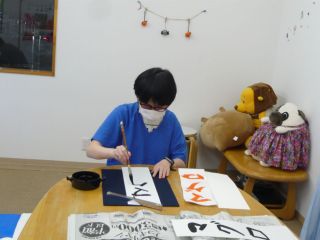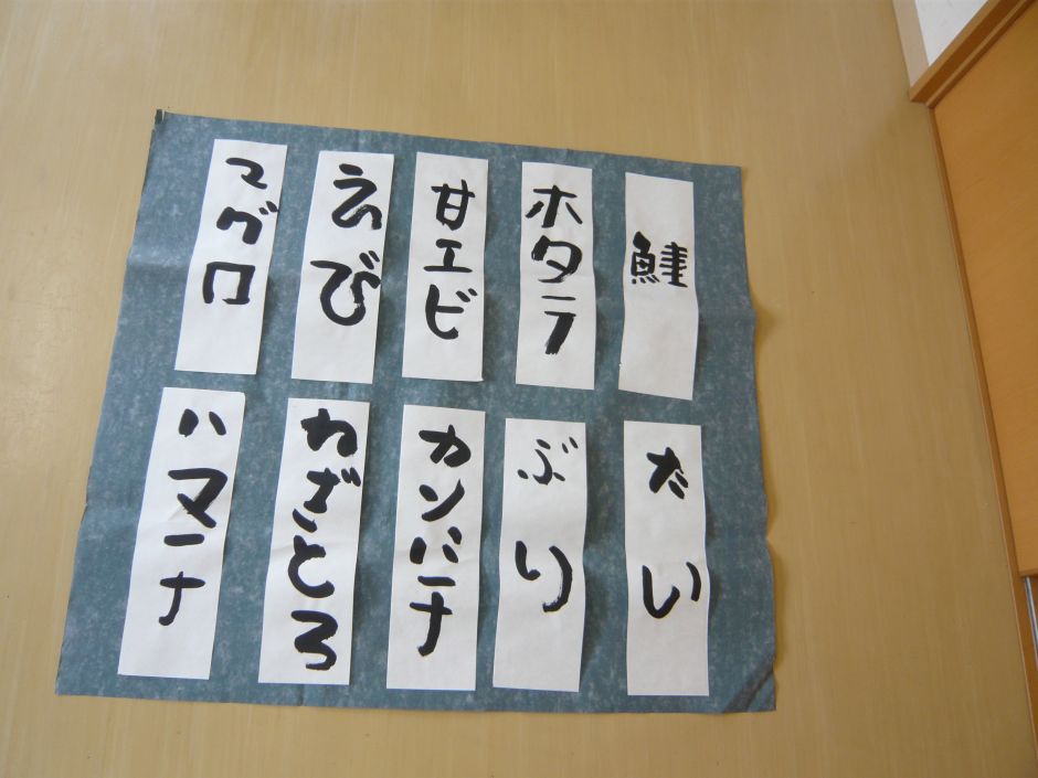 今回のSyoArtのテーマは、“寿司ネタ”でした。 先生のお手本を並べると、「えび好きー。」「マグロがいい。」と、子どもたちが目を輝かせて言っていました。 それぞれにお手本を選んでは書くことを繰り返す中、お互いの作品を見ることも。「おー、それ、いいね!」「うまいわ!」と、感想を言い合い、和やかな雰囲気でした。