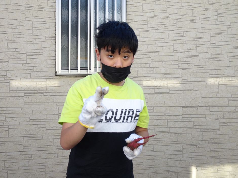 「ん~抜けない…。」「見て!でかい!!。」「小っちゃいイモがある。」など、経験豊富な子どもたちは、みんなで楽しくイモほりをしました。1人のお子さんは、イモの周りの土を少~しずつ少~しずつ掘っていき、まるで考古学者がイモを発掘しているかのよう。下までのびて育った大きなイモでした。