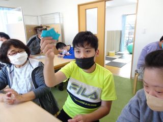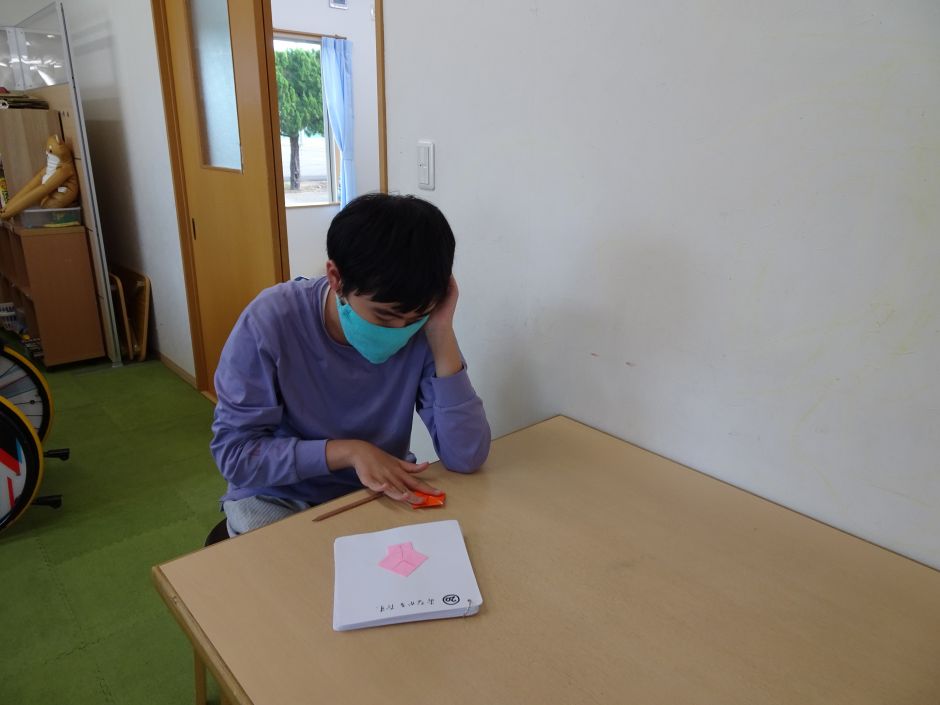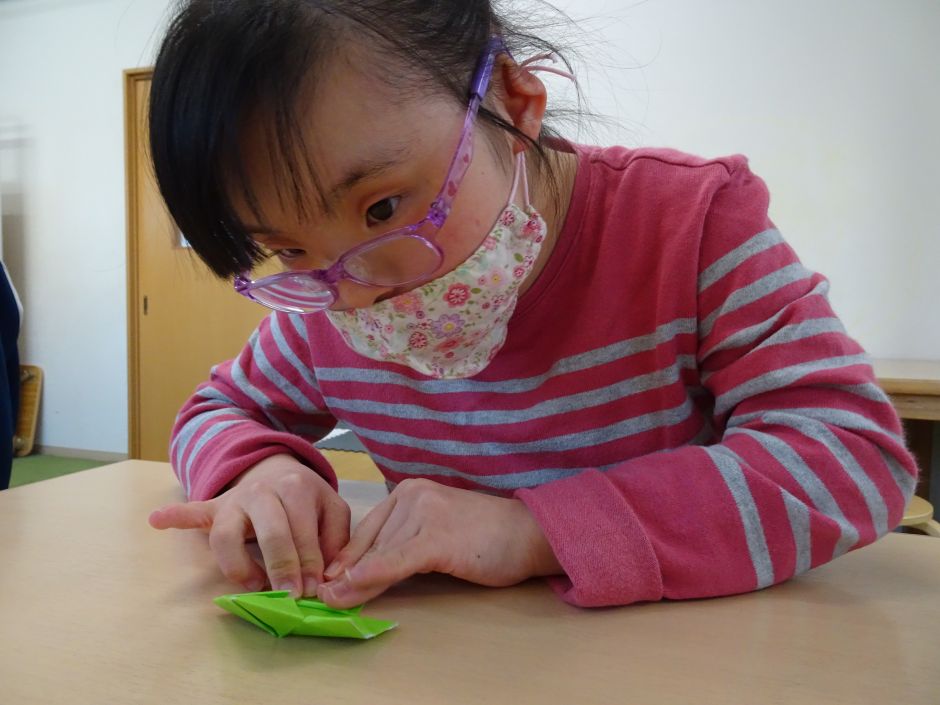 今回の折り紙は、少し¨折り紙¨が苦手な子どもたちが¨挑戦¨してみる1週間でした。 手順書を使って、実際に¨やっこさん¨を折ってみると、自分の手元をよく見ることができていました。 中央の点に角を合わせること、折り目に指アイロンをしっかりすることがポイントでした。 職員から教え、手伝ってもらいながら、子どもたちも意識して取り組めているようでした。
