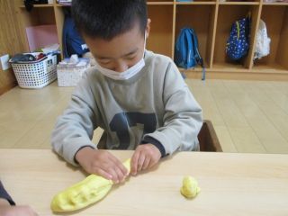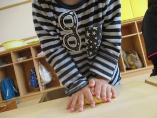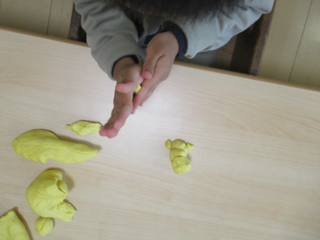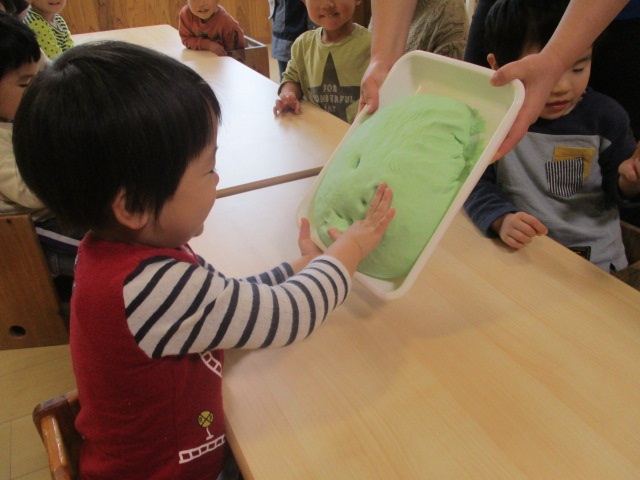 ちょうちょグループで小麦粉粘土あそびをしました。ギュ~っと握ると自分の指の形が出て来ます。強く握らないとなかなか出て来ないのですが、自分の指の形が嬉しく何度も握って楽しむ子どもたちでした!トントン叩いてたら平らになってピザに!コロコロ転がしてたら丸くなったのをお団子に!机でコロコロすればいつの間にかへびになって…引っ張ってちぎって…何度もして楽しみました。手、指、腕、遊びの中で色々な力を使っています。