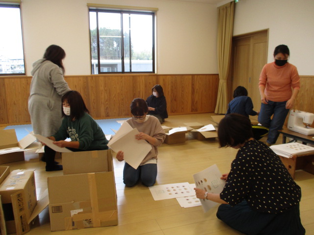 カレンダープロジェクトが最終段階になりました。製本作業が始まっています。あははのゆうぎ室に1ページずつズラリと並べ、12か月分重ねていき、カレンダー上部をミシンで綴じて梱包していきます。ひとつひとつの作業を丁寧に、黙々と進めてくださっているお母さん方。お母さん方と職員とで一丸となり、1000部作り上げていきたいと思います。ただいま予約を承っております!子どもたちの素敵な作品が一人でも多くの方の手元に届きますように。