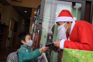 帰りの見送りは、サンタさん!!朝から「今日、サンタさんは来ないの?」と帰る時間になってもやってこないので焦る子どもたちでしたが、無事にプレゼントをもらい嬉しそうでした!