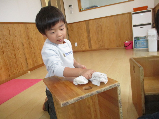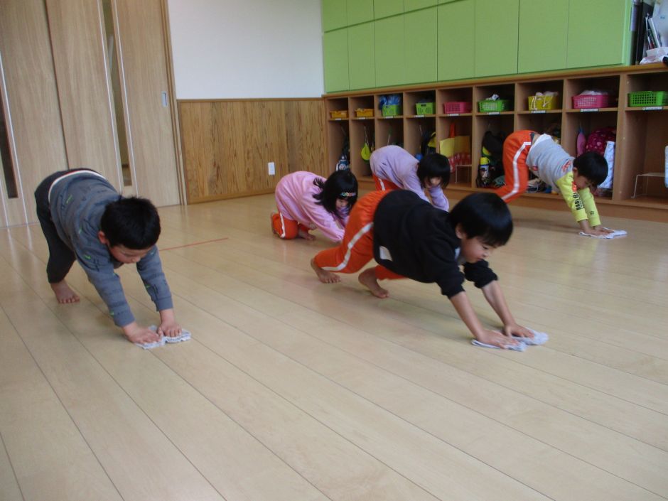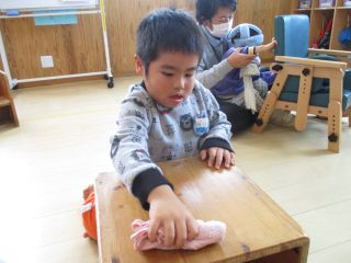 まんまる部門の子どもたちは、毎日あそんでいる部屋の大掃除をしました。雑巾絞りにも挑戦し、「水が冷たい」「手が痛くなった」など、実際にやってみないと感じることのない声もたくさん聞かれました。椅子・ロッカー・床の雑巾がけ、ありがとうの気持ちで綺麗にし、新年を気持ちよく迎えることができそうです。今年も、たくさんのご協力ありがとうございました。来年もよろしくお願い致します。