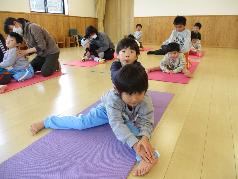 柔軟体操から始まり、からだをほぐしてから取り組みが始まります。