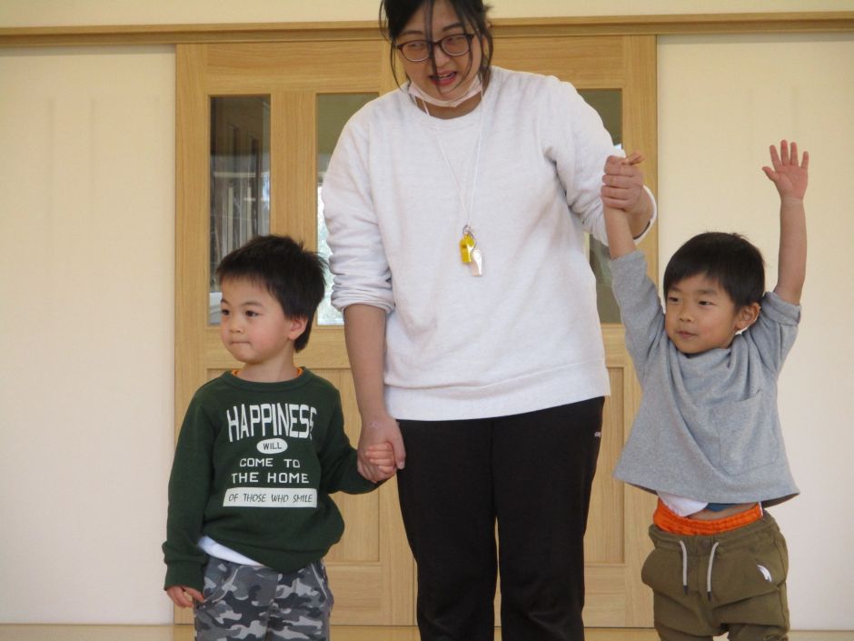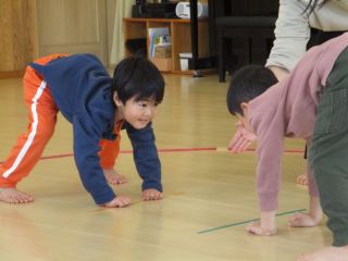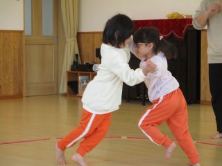 保育者の「見合って見合って~、はっけよーいのこった!!」の声掛けに耳を傾け