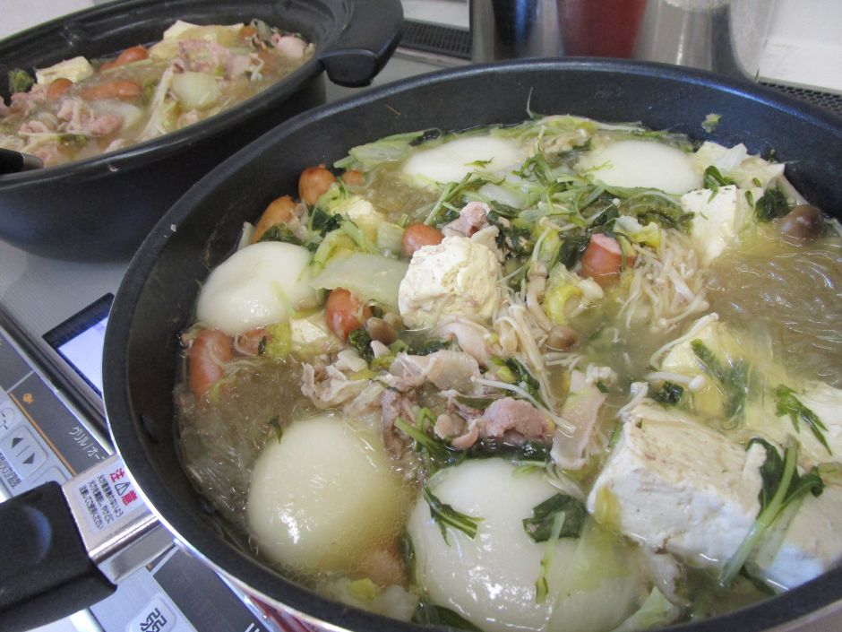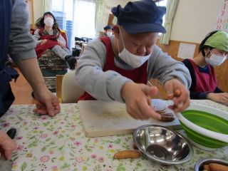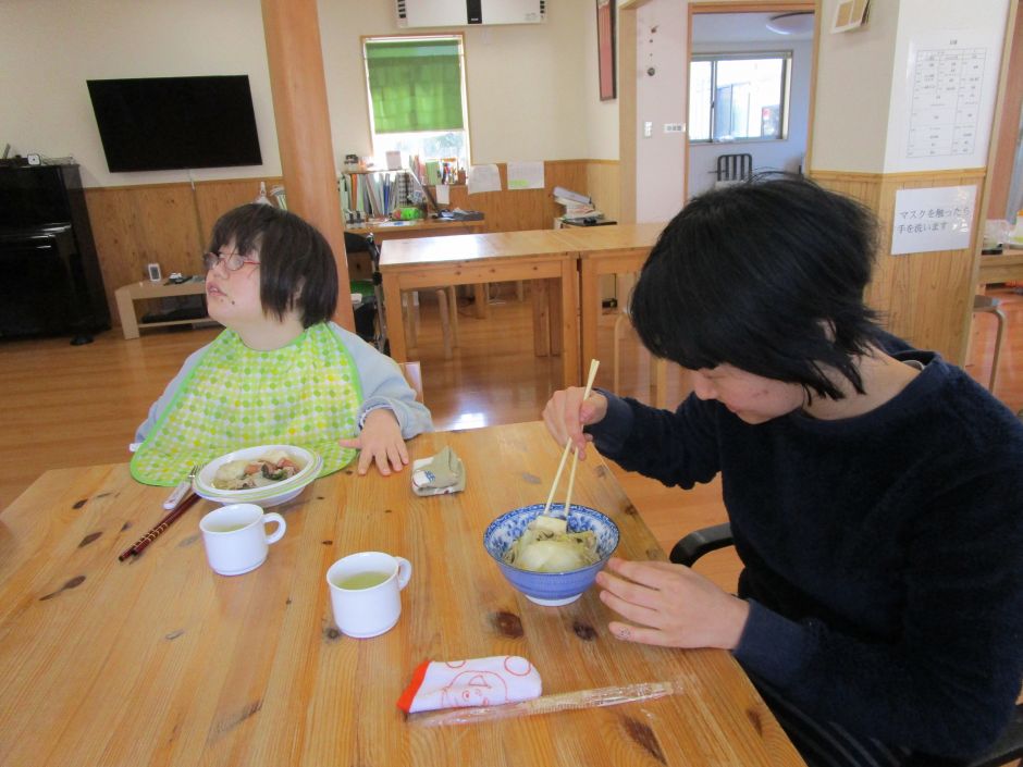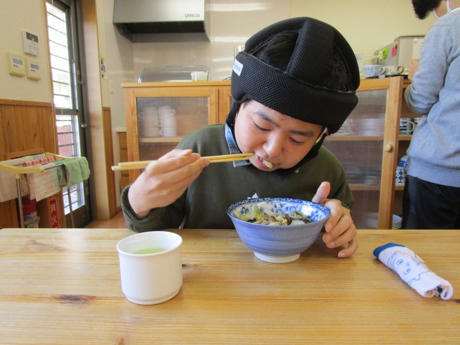 寒いですね(*_*)月に一度のクッキングで体が温まる鍋を作りました。白菜や皆さんが大好きなウインナーを切ったり、それぞれ分担するのですが、ウチには“シメジちぎり”と“エノキ裂き”のプロがいます(^_-)-☆鍋に材料を入れて煮込むと、グツグツといい音と部屋中いい匂いがして、鍋を覗く方もいました(*^^*)締めはラーメン!そしてお餅も美味しく頂きました♪