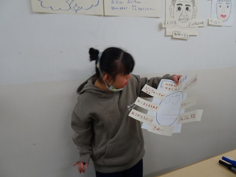 今週の¨自分発見✨¨も自分のルーツを知ろうということで、テーマは「家族」。それぞれが思い浮かぶ「家族」を1人考えてもらいました。子どもたちは、誰にすればいいのか、目が・・・と困った表情。話し合いをする中で、¨お父さん、お兄ちゃん、お姉ちゃん、妹など¨が出てきていました。中には、¨いとこの○○さん¨と出てくる子どもも。 イメージする言葉に¨かっこいい¨¨強い¨¨しょうちゅう¨¨スマホ¨など。子どもたちなりの家族像があり、とてもおもしろい時間でした。