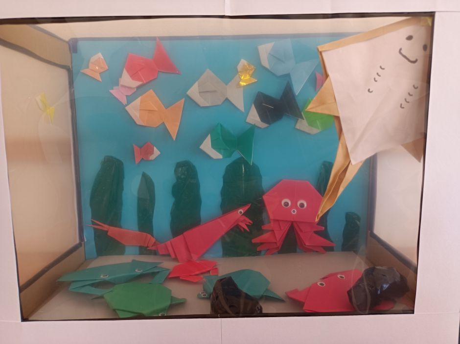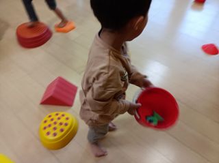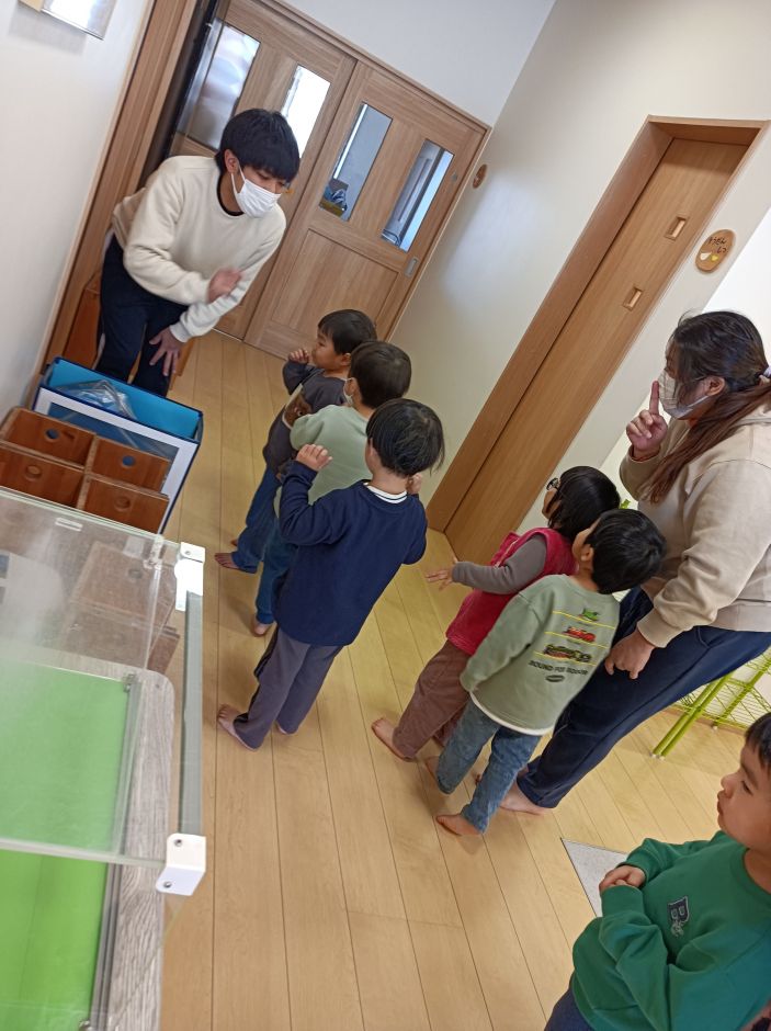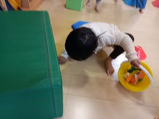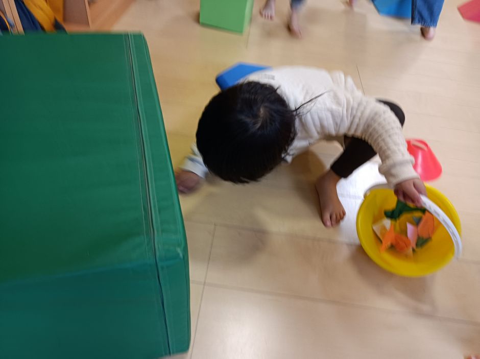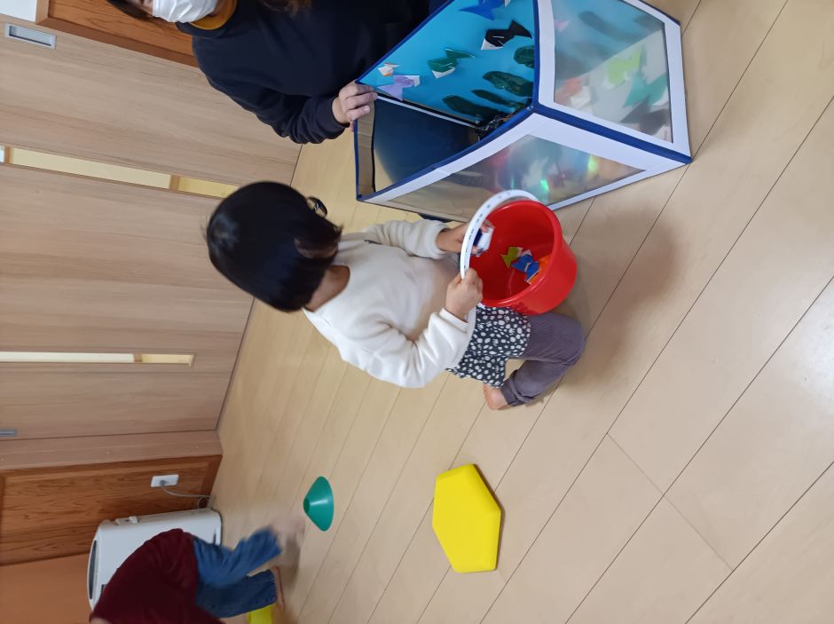 水槽の中は空っぽ。「魚がいない!」子どもたちはキョロキョロ。「あっちのお部屋かな?」と子ども達。そこにあったブロックの下を探しまわる子どもたち。すると、「見つけたぁ!」とお魚を発見し嬉しそう!子どもたちはたくさんお魚を見つけて楽しんでいました☆