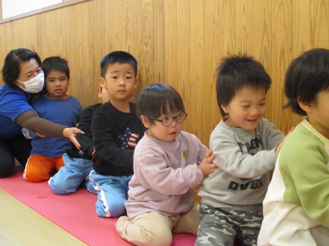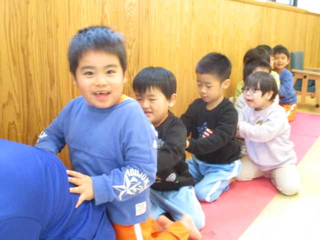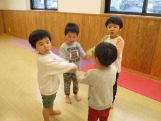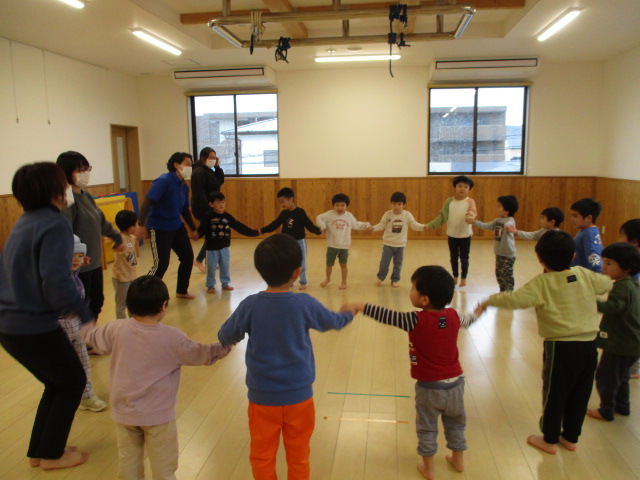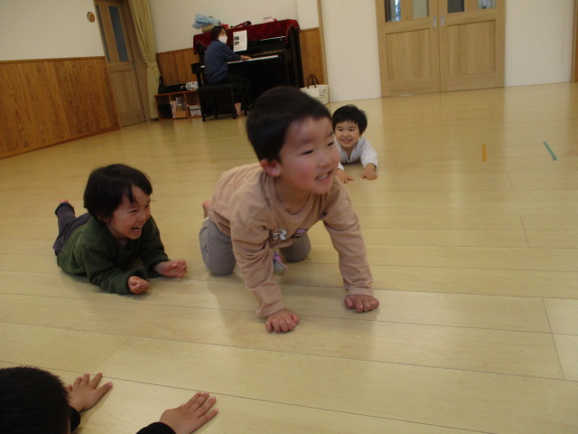 ちょうちょグループ・かぜグループ合同でうたあそびをしました。初めは不思議そうでしたが、「まんまるさんだぁ」「ちょうちょさんいるね」とお互いのお顔を見てなんだか嬉しそうな子ども達…最後は「またあそぼうね~」とお約束をして、とっても楽しい一日になりました!