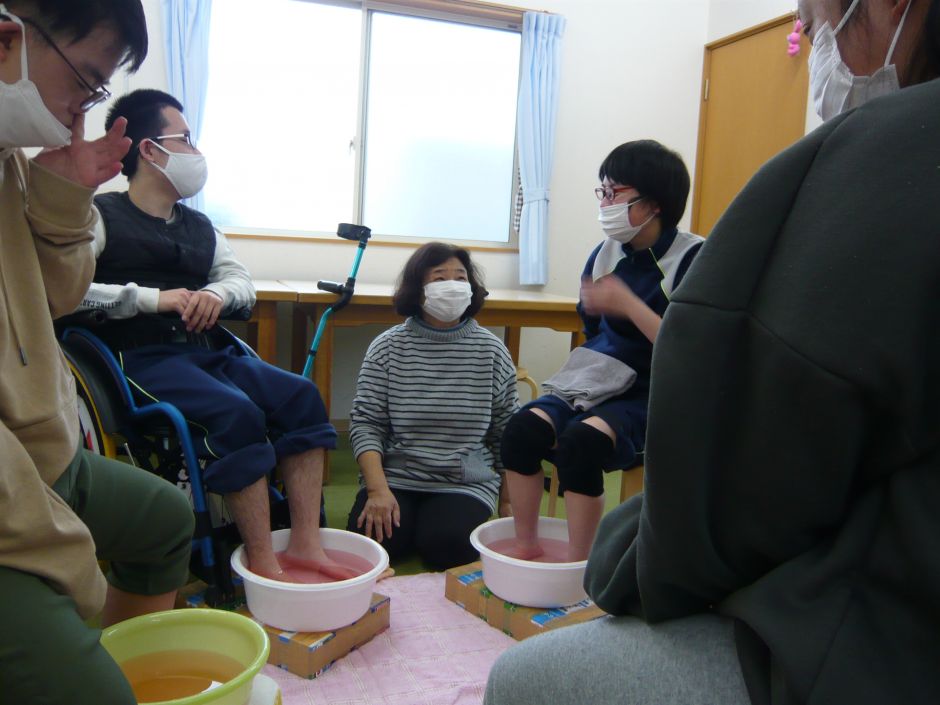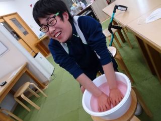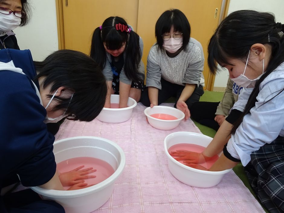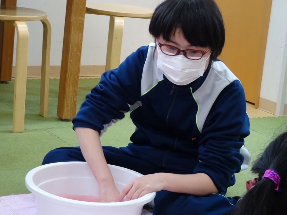 寒いこの時期、『Let`sキュート』の活動で、手湯、足湯をしました。 入浴剤を入れた温かいお湯に手や足をつけた子どもたちからは、「あ~、気持ちいぃ~。」「あったか~ぃ。」「いい匂い。」と、思わず言葉がもれていました。 リラクゼーションのBGMも聴きながらゆったり、ほっこりしたひと時を過ごしました。