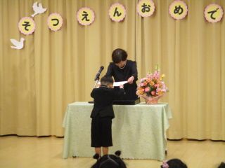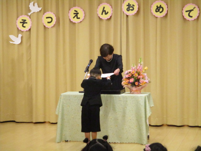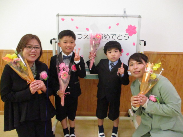 3月11日卒園式が行われました。お母さんと一緒に通園した日々。泣いたこと。笑ったこと。友だちみんなで遊んだこと。今までのことを思い出しながらも卒園児2人の成長を感じられる式でした。かわいい2人にそしてご家族にこれから先、素晴らしい出会いが待っていますように。